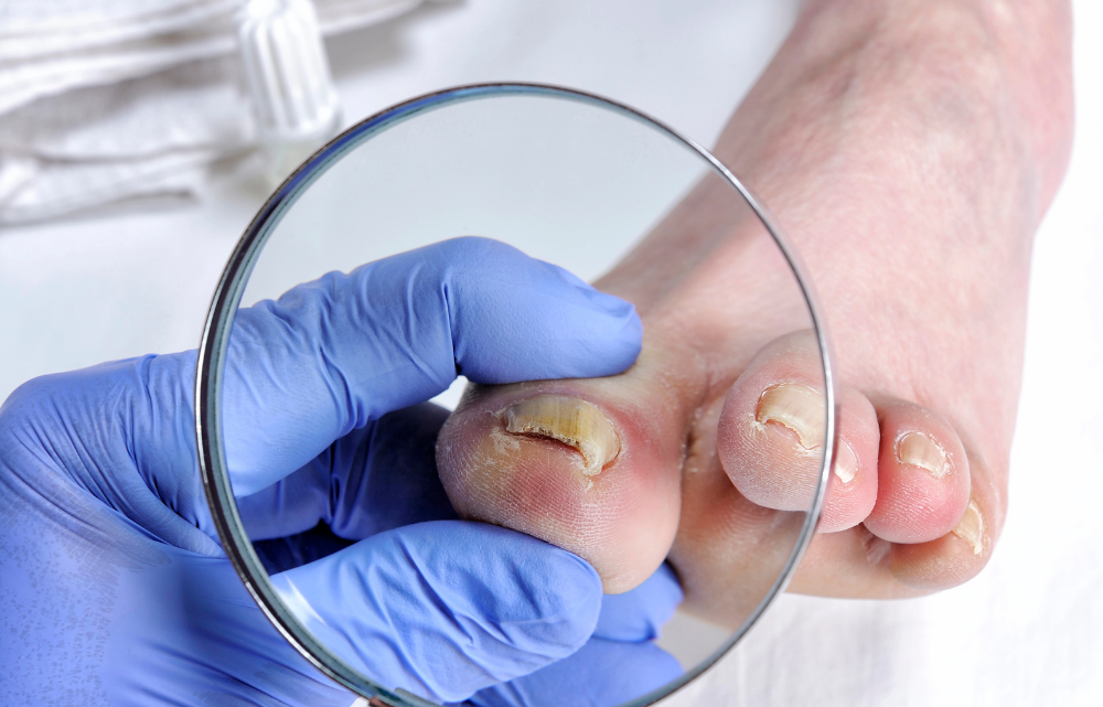 Yellow, brittle nails caused by fungal growth under the nail bed.