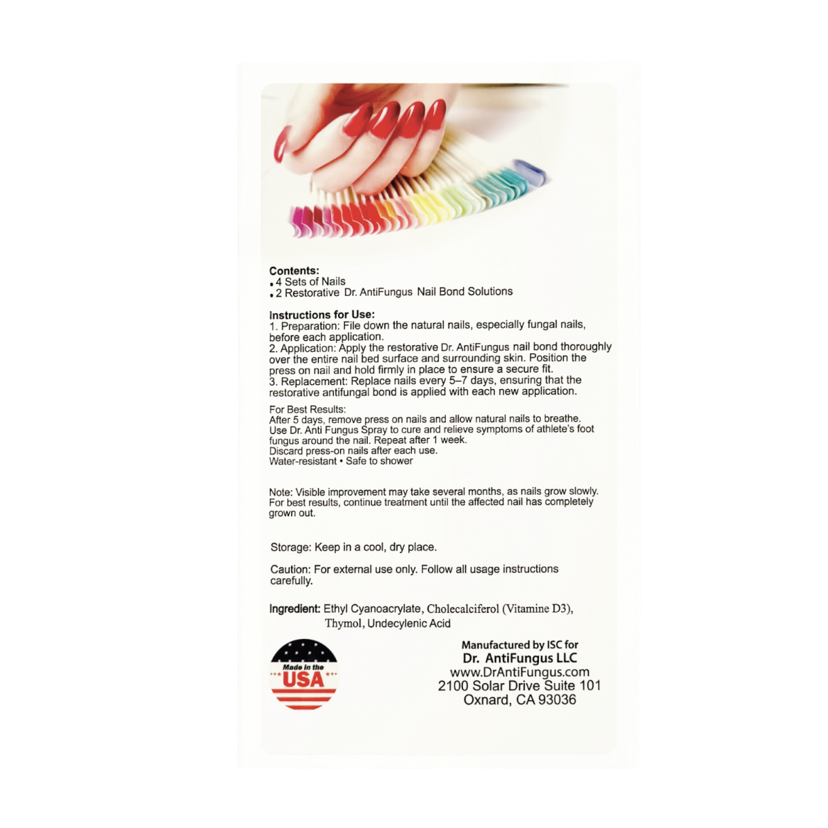 Apply: Apply the restorative Dr. AntiFungus nail bond thoroughly over the entire nail bed and surrounding skin. Position the press-on nail and hold firmly in place to ensure a secure fit.